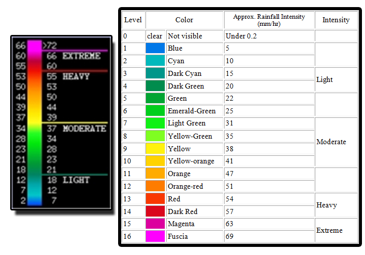 There are sixteen levels of rainfall intensity shown on the images - each level provides an approximate indication of the rainfall rate in millimeters per hour. The following values can be used as a general guide but as I already explained are not always accurate.